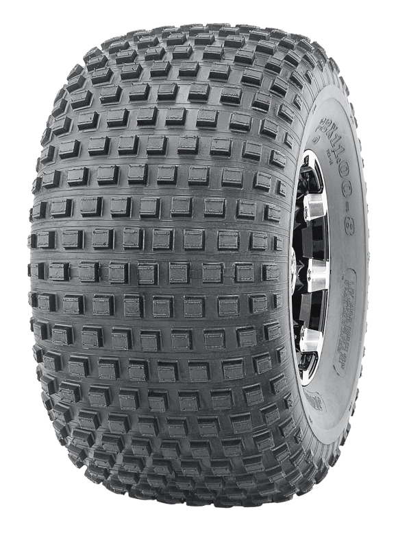 - Mønsteret består af tætsiddende, firkantede knaster, der dækker hele slidbanen og sikrer en bred og stabil kontaktflade mod underlaget. Denne opbygning giver jævn fremdrift og forbedret kontrol ved acceleration og bremsning. Den ensartede blokfordeling bidrager samtidig til stabil retningskontrol og forudsigelig håndtering i sving og ved ujævnt terræn.